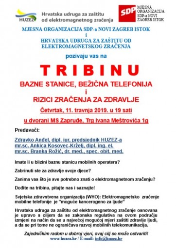 SDP Novi Zagreb Istok organizator je predavanja pod nazivom: Bazne stanice, bežićna telefonija i rizici za zdravlje, koje će se održati danas s početkom u 10 sati na adresi Trg Ivana Meštrovića Zagreb.