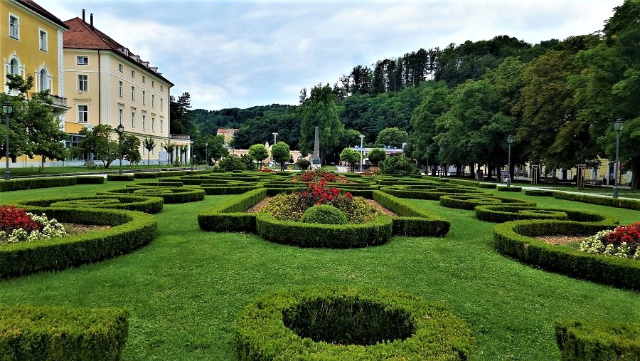 Od platoa prema jugu se prostire poznati Lječilišni park uređen u francuskom stilu, u kojem se između ostalog nalazi 700 ruža i stablo ginko te Vremenska kućica iz 1926. godine na kojoj stoji natpis: Pijenjem mineralne vode ojačat ćete zdravlje! U njemu se nalazi i poznata fontana, koja je inače obnovljena 2011. ali u trenutku našeg posjeta nije radila.