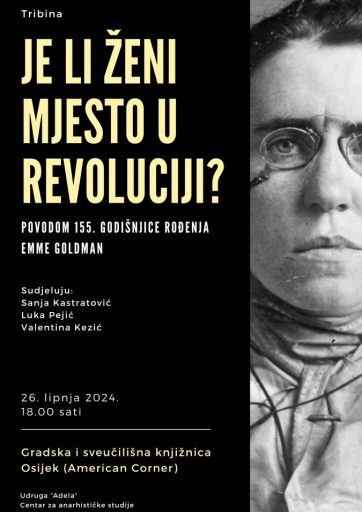 U srijedu, 26. lipnja 2024., u organizaciji udruge „Adela“ i Centra za anarhističke studije održat će se tribina naslovljena „Je li ženi mjesto u revoluciji? Povodom 155. godišnjice rođenja Emme Goldman“. Događanje će se održati u Gradskoj i sveučilišnoj knjižnici Osijek (American Corner) s početkom u 18.00 sati. Na tribini će sudjelovati Sanja Kastratović (udruga „Adela“), Luka Pejić (Centar za anarhističke studije) i Valentina Kezić. Ulaz je slobodan za sve zainteresirane.