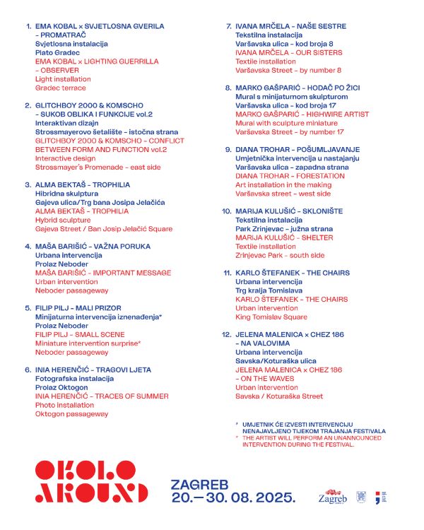 Zagreb, 18. kolovoz 2025. – Ove godine, Okolo ponovno šeće zagrebačkim ulicama – i vodi vas sa sobom! Osmo izdanje umjetničkog projekta Okolo, posvećenog umjetnosti u javnom prostoru i zajednici, i ove godine donosi dozu kreativnog osvježenja u gradsku svakodnevicu. U suradnji s Turističkom zajednicom grada Zagreba, Okolo zakazuje novi susret s umjetnošću na zagrebačkim ulicama, pozivajući vas da od 20. do 30. kolovoza zalutate u umjetnost i istražite Zagreb kroz jedinstvenu umjetničku šetnju.