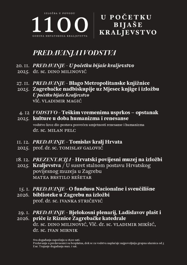 Galerija Klovićevi dvori poziva na predavanja i vodstva koja će se održati u sklopu izložbe “U početku bijaše Kraljevstvo – 1100 godina Hrvatskoga Kraljevstva”.
