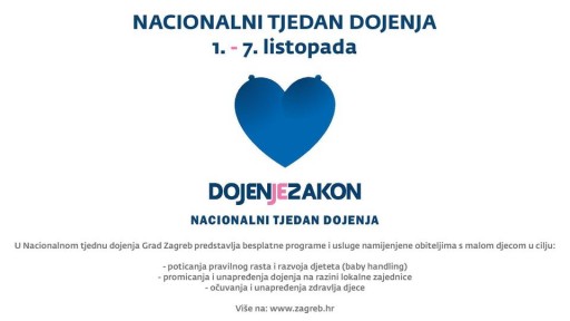 Nacionalni tjedan dojenja svake se godine obilježava od 1. do 7. listopada sa ciljem poticanja svijesti o važnosti i dobrobiti dojenja za dijete, majku i cjelokupnu zajednicu. U Nacionalnom tjednu dojenja 2020. predstavit će se besplatni programi i usluge namijenjene obiteljima s malom djecom u cilju: • poticanja pravilnog rasta i razvoja djeteta (baby handling) …