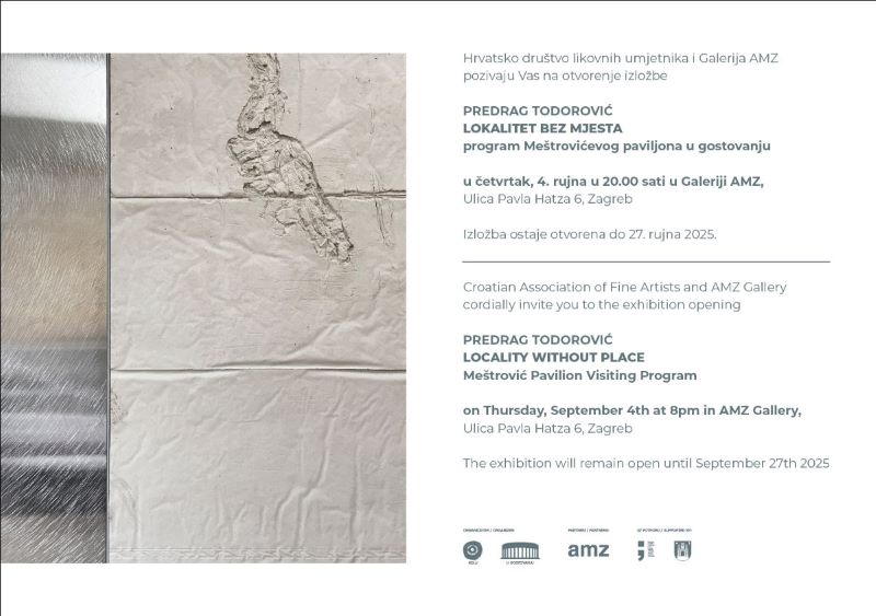 Arheološki muzej u Zagrebu Trg Nikole Šubića Zrinskog 19 Zagreb U četvrtak, 4. rujna 2025., s početkom u 20 sati, u Galeriji AMZ (Pavla Hatza 6), održat će se otvorenje samostalne izložbe Predraga Todorovića – Lokalitet bez mjesta. Izložba u organizaciji Hrvatskih likovnih umjetnika dio je programa Meštrovićev paviljon u gostovanju i ostaje otvorena do …