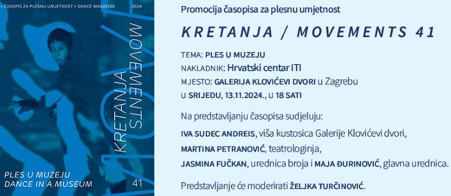 HRVATSKI CENTAR ITI i uredništvo časopisa za plesnu umjetnost Kretanja / Movements pozivaju Vas na predstavljanje novog broja Kretanja / Movements 41. – PLES U MUZEJU. Promocija će se održati u Galeriji Klovićevi dvori u Zagrebu u srijedu, 13. studenoga 2024. u 18 sati. Časopis će predstaviti: Kretanja / Movements je informativni i stručni, dvojezični časopis za plesnu umjetnost posvećen raznim temama …