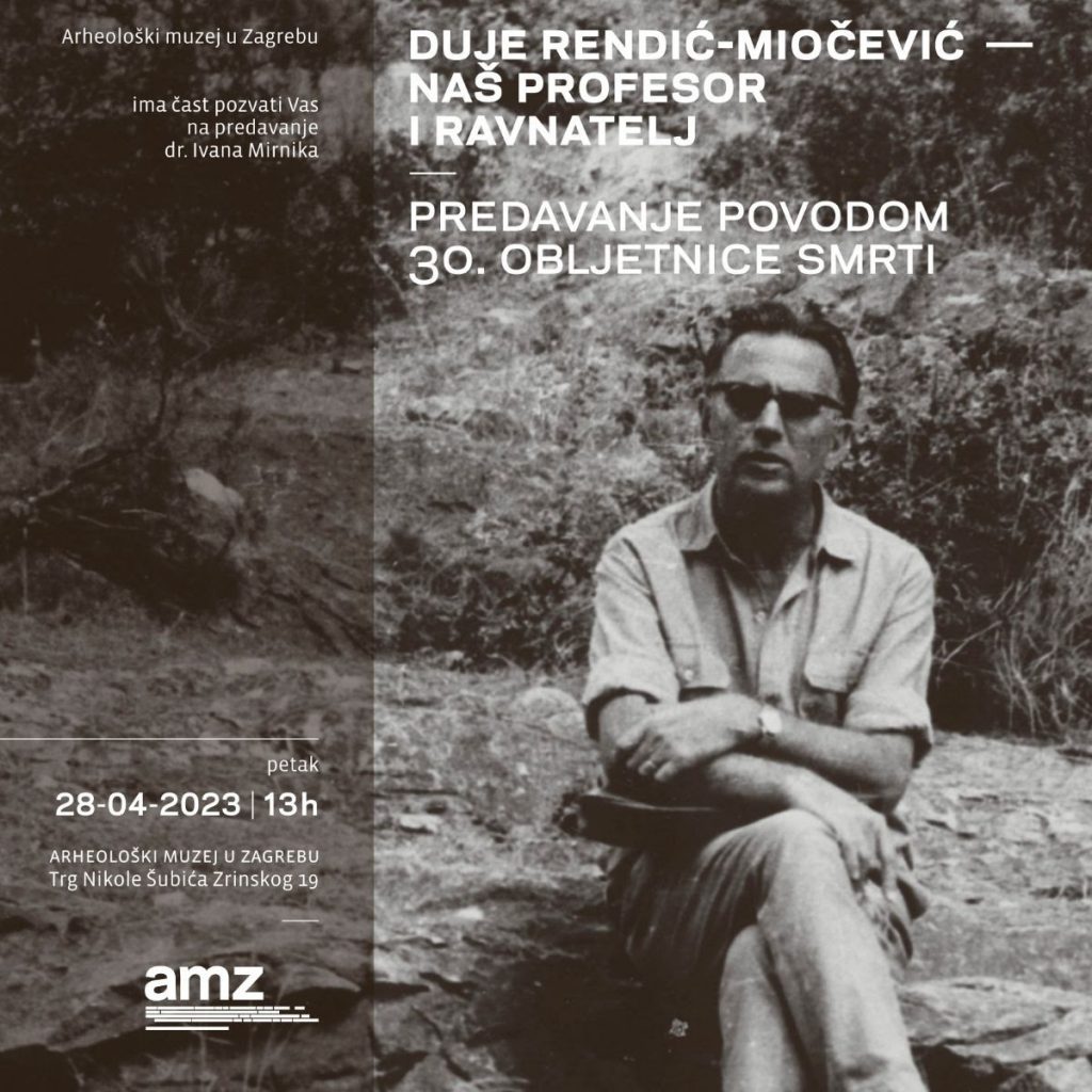U petak, 28. travnja 2023. godine s početkom u 13. sati, u Velikoj dvorani na 1. katu Arheološkog muzeja u Zagrebu, u povodu 30. godišnjice smrti Duje Rendića-Miočevića, dr. sc. Ivan Mirnik održat će predavanje DUJE RENDIĆ-MIOČEVIĆ. NAŠ PROFESOR I RAVNATELJ. Bilo bi vjerojatno nezahvalno pokušati izdvojiti najzaslužnijeg istraživača antičke baštine u Hrvatskoj tijekom 20. …