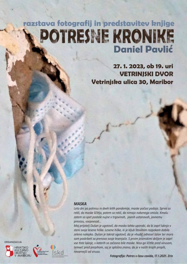 Autor: Aleksandar Olujić U petak, 27. siječnja 2023., će u 19 sati u Vetrinjskom dvoru u Mariboru biti svečano otvorena izložba fotografija „Potresne kronike“ Daniela Pavlića. Autor fotografija, Daniel Pavlić, koji se nakon katastrofalnog potresa 2020. nesebično angažirao u pomoći postradalima, za što je nagrađen od strane Hrvatskog novinarskog društva priznanjem „Fra Ma Fu” za …